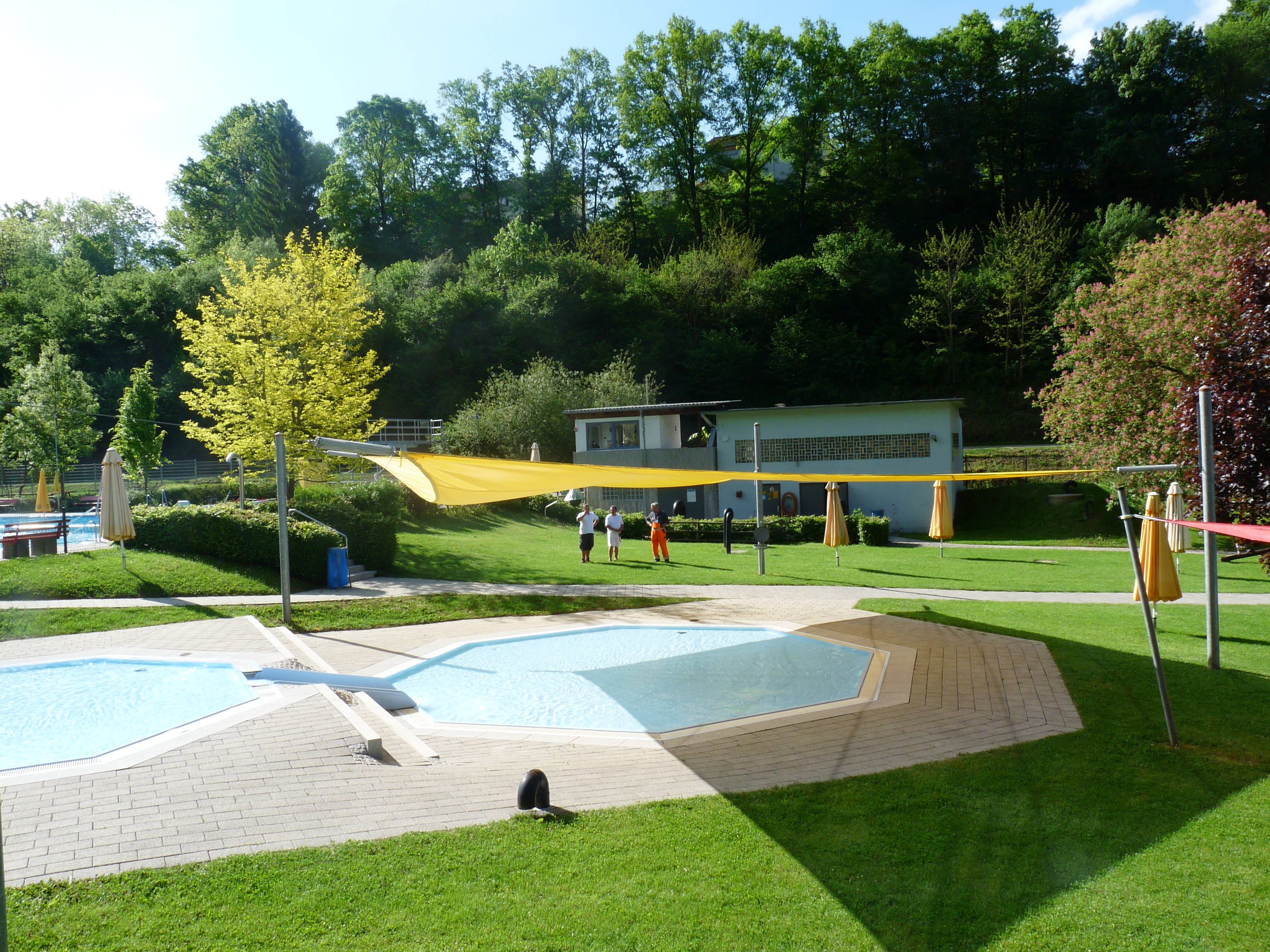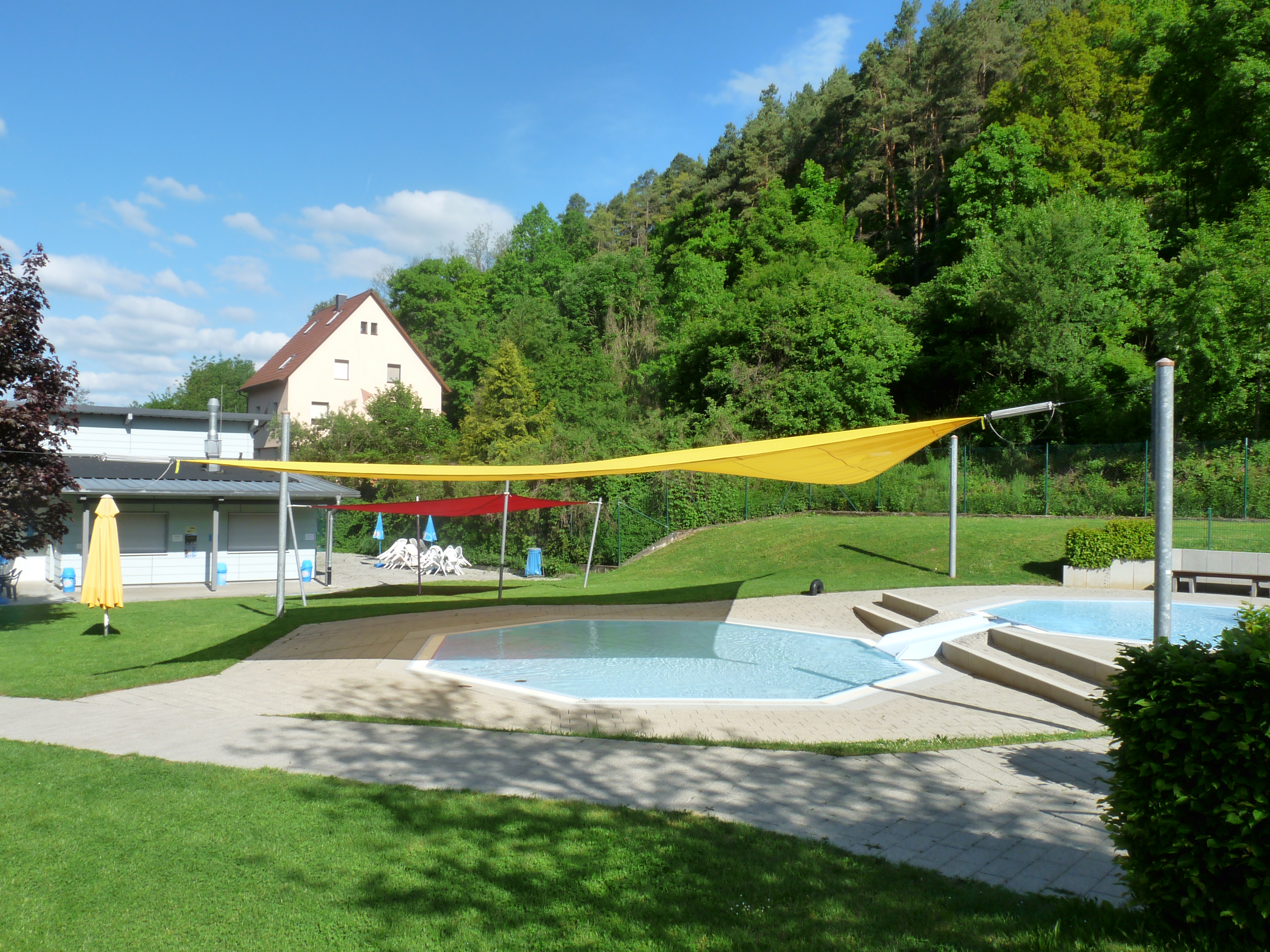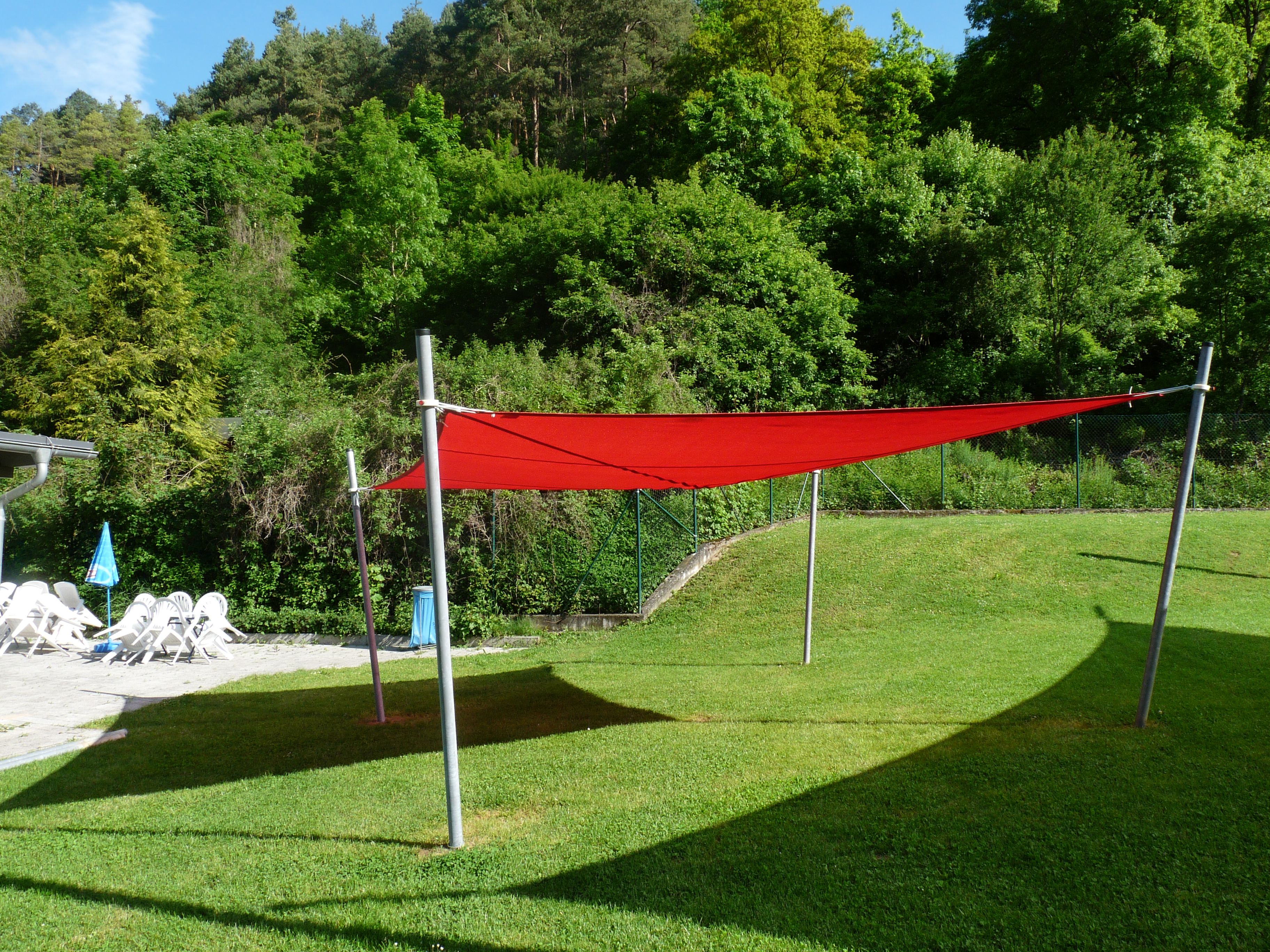 Diese Woche wurde auch im Freibad in Adelsheim das Sonnensegel über dem Kleinkinderbecken montiert. Das Sonnensegel über dem Kinderbecken hat Seitenlängen von 11,39 x 9,00 x 9,07 x 11,54 Meter und ist in der Farbe „Butterblumengelb“. Mit einer Fläche von 102 m² gehört dieses Sonnensegel zu den etwas Größeren, dennoch ist durch unsere individuelle Planung der Segel, fast jede große herstellbar und somit sind den Kundenwünschen keine Grenzen gesetzt. Des Weiteren wurden noch ein kleines Sonnensegel in der Liegewiese montiert, mit einer Größe von 28,09 m².
